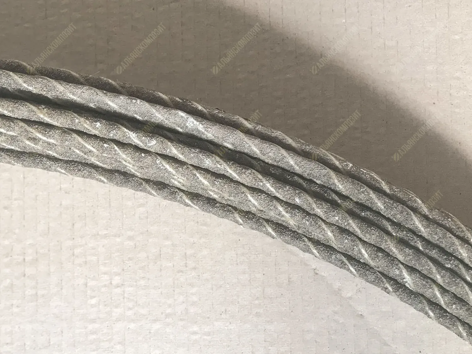 Материал стержня: стеклоровинг. Для уплотнения стеклянных волокон в стержне арматуры жгут стеклопластика перетянут нитью.
