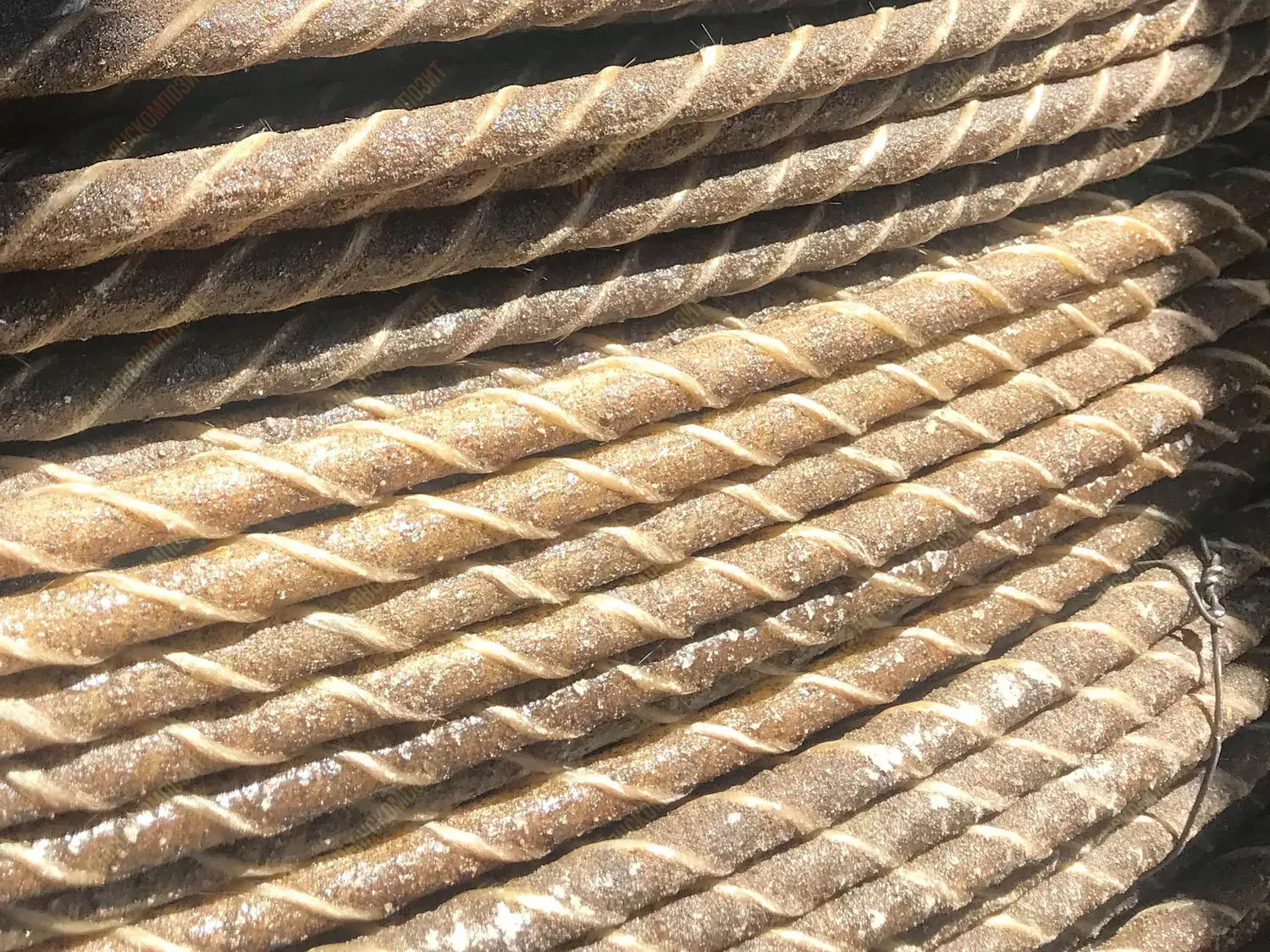 Материал стержня: стеклоровинг. Для уплотнения стеклянных волокон в стержне арматуры жгут стеклопластика перетянут нитью.